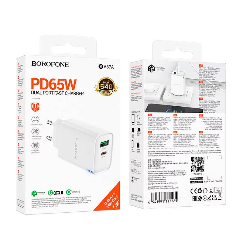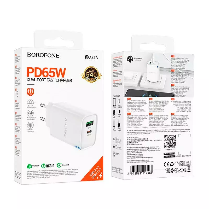 СЗУ BOROFONE BA87A, PD65W+Q3.0, 1xUSB+1xUSB-C, 65W, White, Box