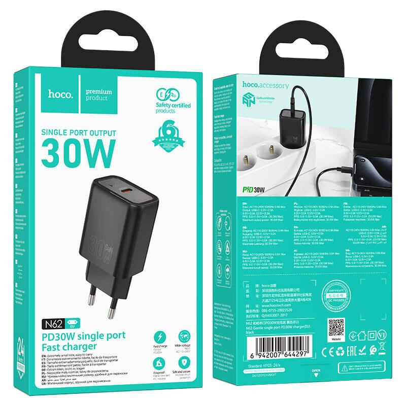 СЗУ HOCO N62 110-240V, PD30W, USB-C, Black, Box