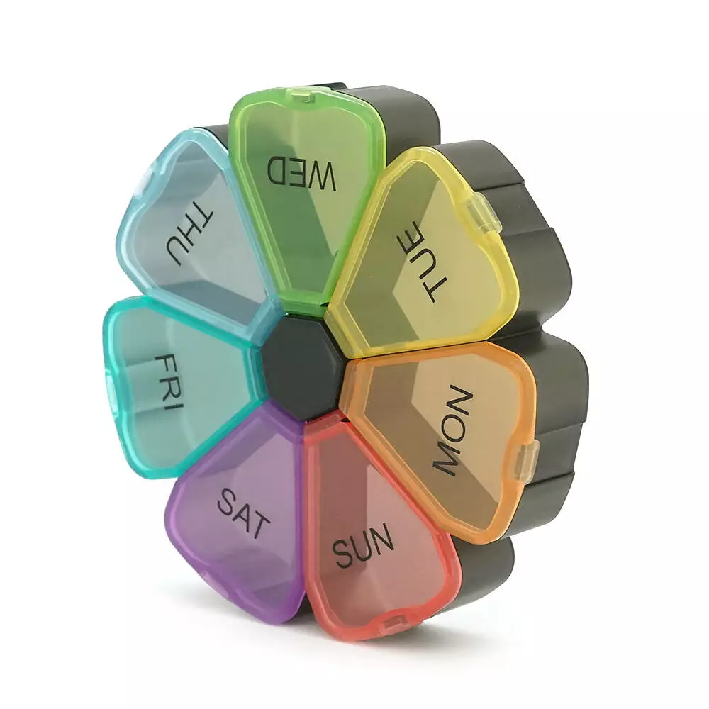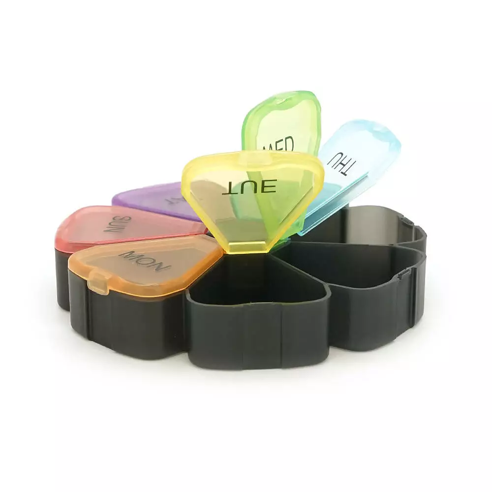 - Сім індивідуальних відділень із кришками для кожного дня тижня