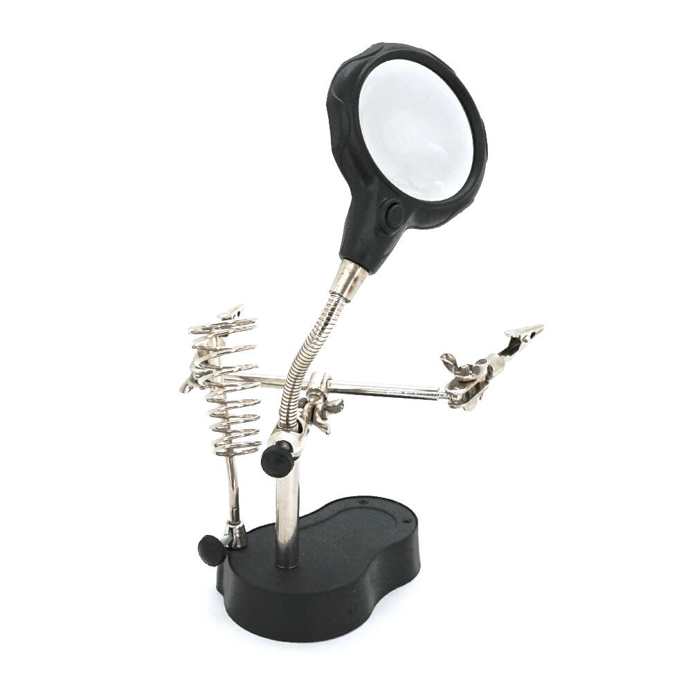Тримач "третя рука" TE-801 є компактним пристроєм, призначеним для кріплення та утримання різних предметів при виконанні дрібних робіт. Він має регульований діаметр 60 мм і забезпечує збільшення в 3.5-12 разів, що робить його універсальним інструментом для різних завдань.