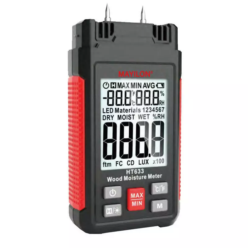 Вимірник вологості деревини Mayilon HT-633 допоможе вам швидко і точно визначити вологість різних видів деревини завдяки спеціальній функції вибору типу матеріалу. Він стане незамінним інструментом для будівельників, дизайнерів інтер'єру та всіх, хто працює з деревиною.