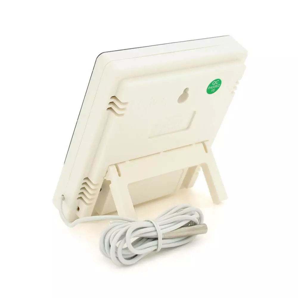 Пристрій оснащений чітким РК-дисплеєм з роздільним відображенням показників температури, вологості та часу. Компактний корпус дозволяє розмістити прилад на столі, полиці чи закріпити на стіні. Дворежимна робота забезпечує можливість перемикання між відображенням часу та кліматичних параметрів.