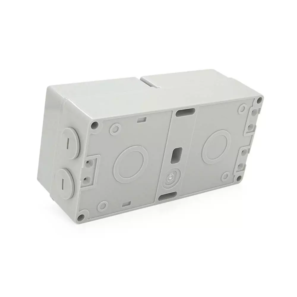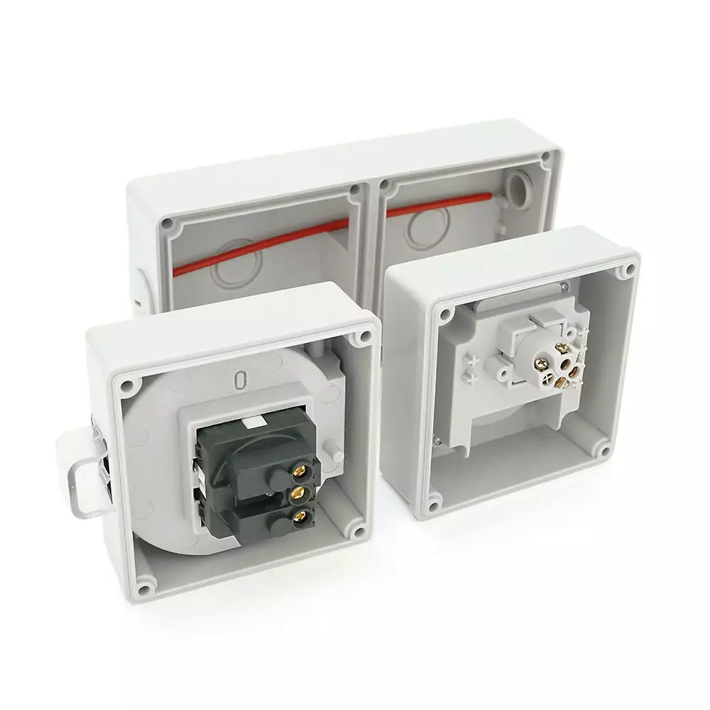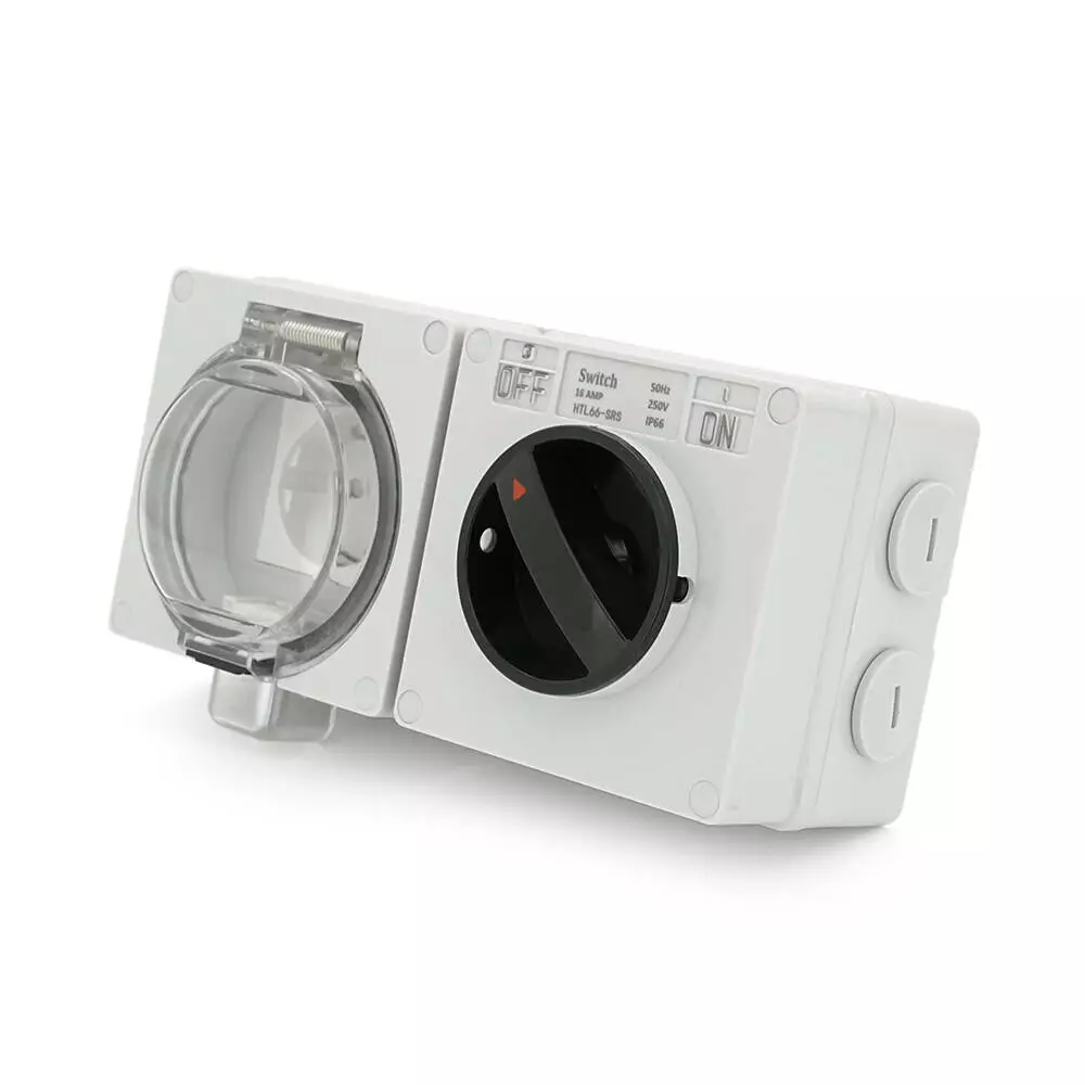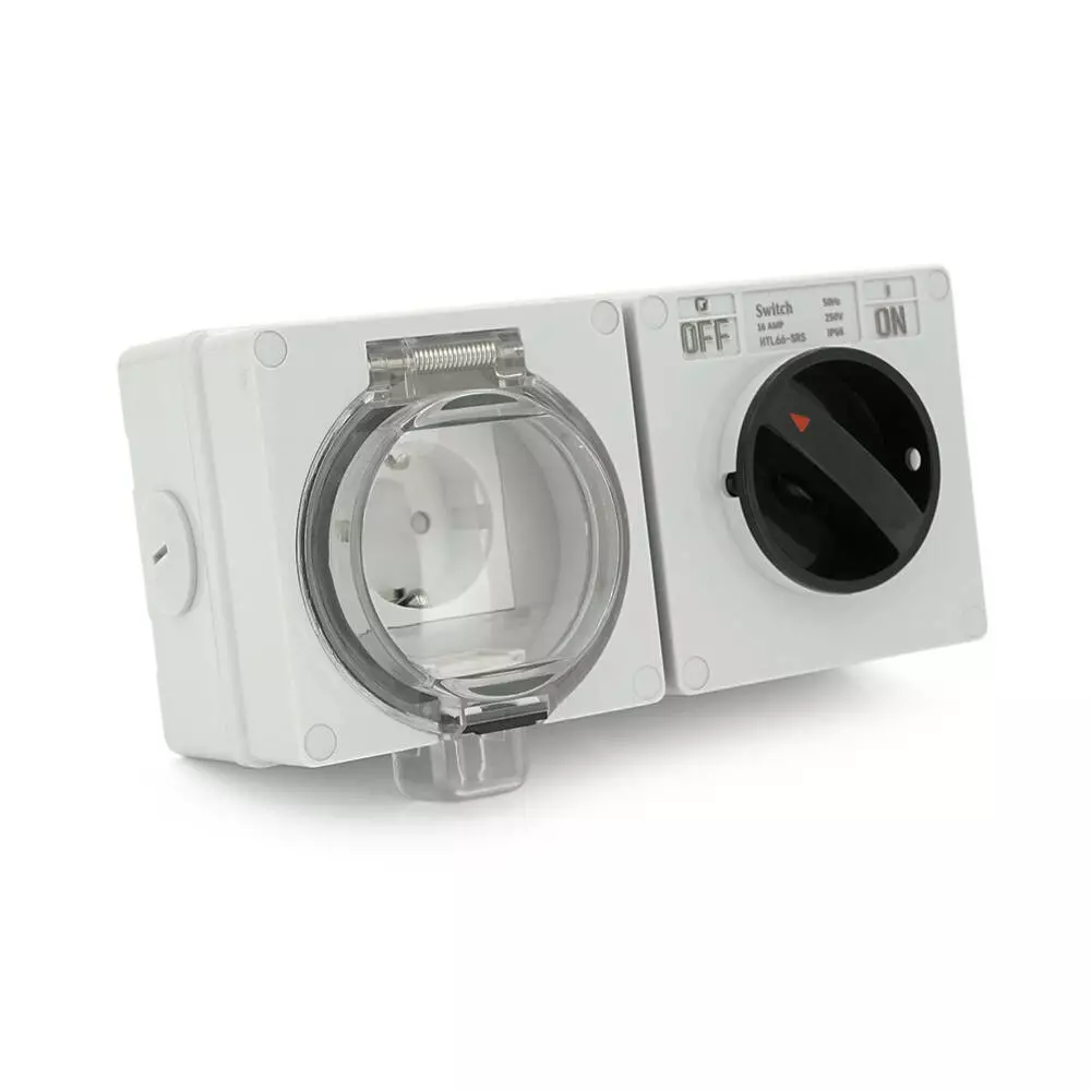 Цей вимикач + розетка призначені для зовнішнього монтажу та мають двосторонній висновок. Їх захисний клас IP65 гарантує стійкість до пилу та вологи. Вони здатні працювати при напрузі до 250В та струмі до 16А. Колір корпусу – сірий.
