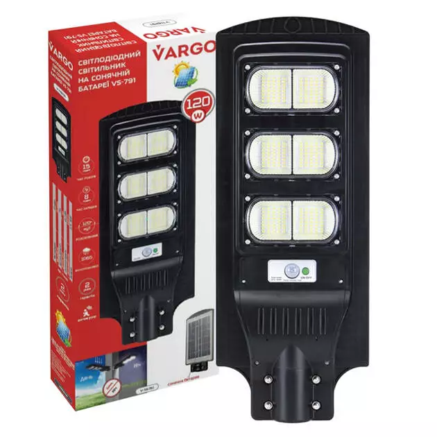 Вуличний ліхтар Vargo із сонячною батареєю на стовп 3VPP, 1 режим, корпус-міцний пластик, 120W, 6500K, 5400Lm, ip66, вбудований акум, Black, Box