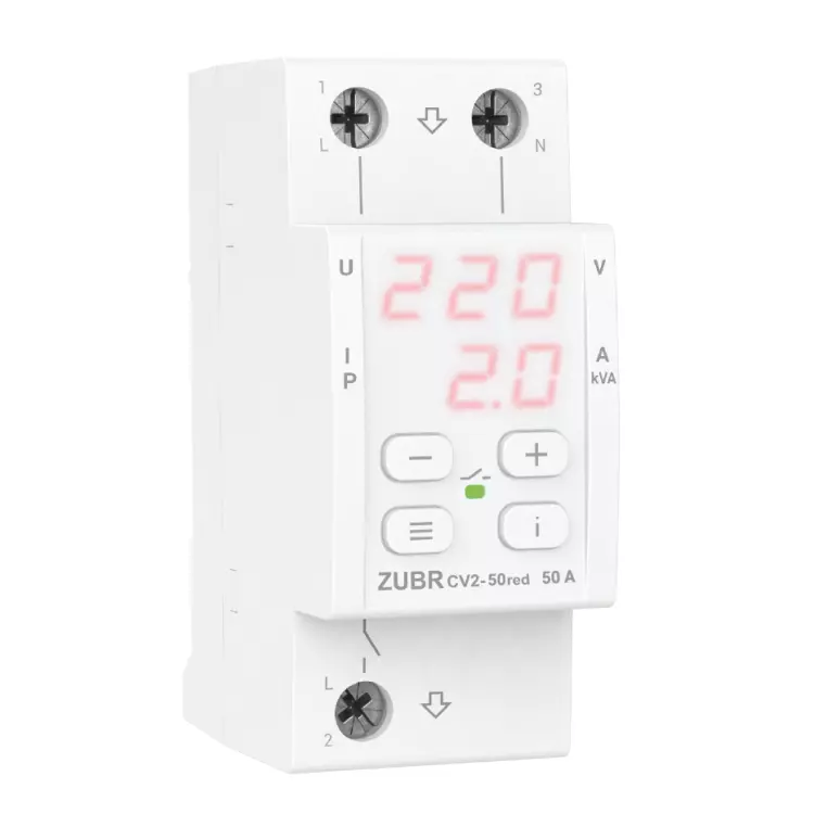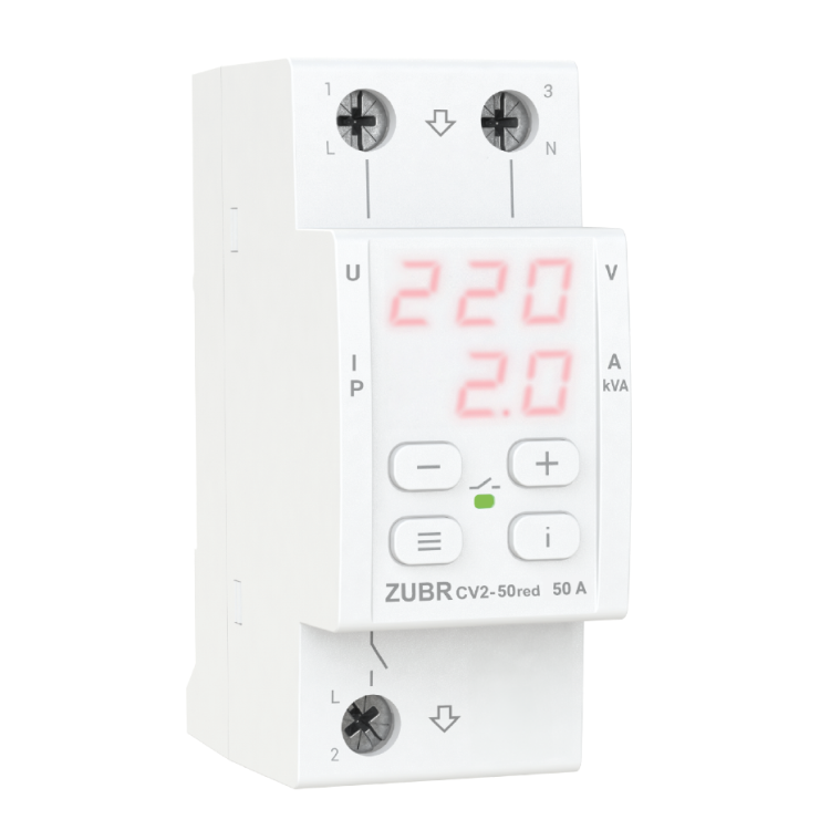 Захисне реле напруги однофазне CV2-63 з контролем струму на DIN-рейку, 63А, 13900ВА, 120-280В, двомодульне з індикатором напруги (Червоний)