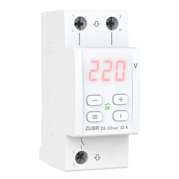 Захисне реле напруги однофазне D2-32 на DIN-рейку, 32А, 7000ВА, 120-280В, двомодульне з індикатором напруги (Червоний)