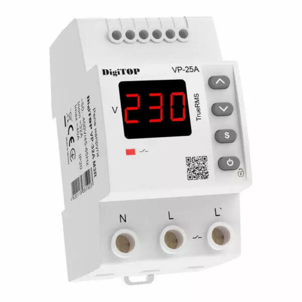 Захисне реле напруги однофазне VP-25AM3R на DIN-рейку, 25А, 5500Вт, 120-270В, тримодульне з індикатором напруги (червоний)