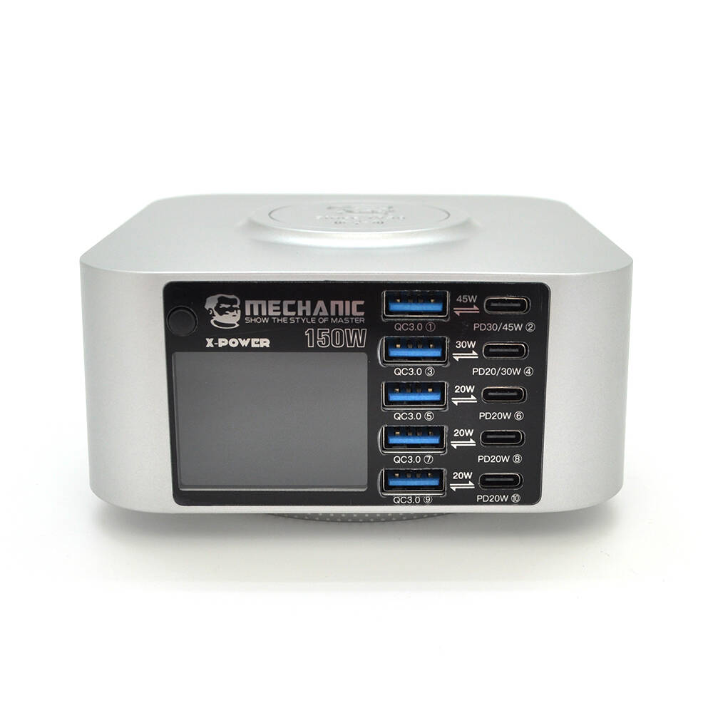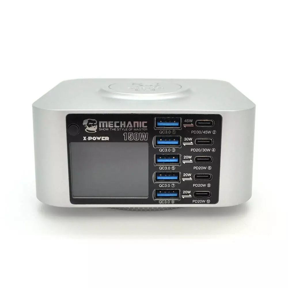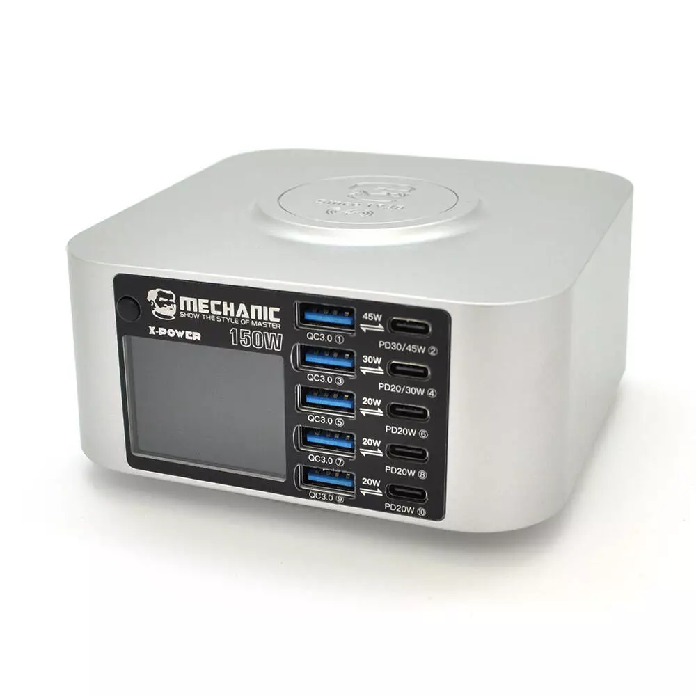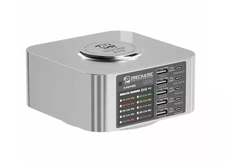 Зарядна станція з індикацією LED MECHANIC X-Power, 5*PD3.1-45W, 5*QC3.0-30W, 5В3А,9В2.2A,12В1.67А, Wireless Charging 15W, 220V/150W. 119*119*60mm
