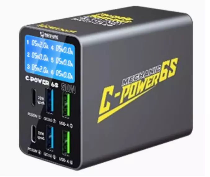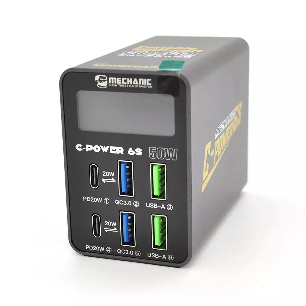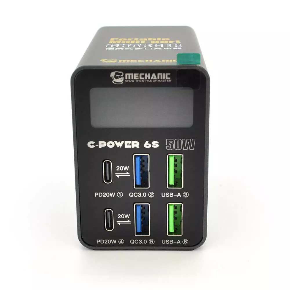 Зарядна станція з цифровою індикацією MECHANIC C-Power 6S, 2*USB-A, 2*QC3.0-5В3А,9В2A,12В1.5А, 2*PD3.1-5В3А,9В2.22A,12В1.67А, 220V/50W.150*100*50mm
