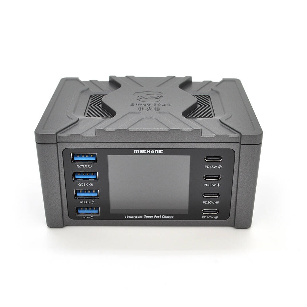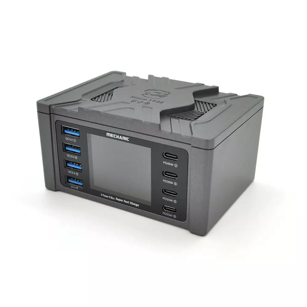 Зарядна станція з цифровою індикацією MECHANIC V-Power 8 Max, 4*QC3.0-5В3А,9В2A, 4*PD3.1-(5В/9В/12В/15В)3А,20В2,25A, 220V/115W. 114*60*84mm