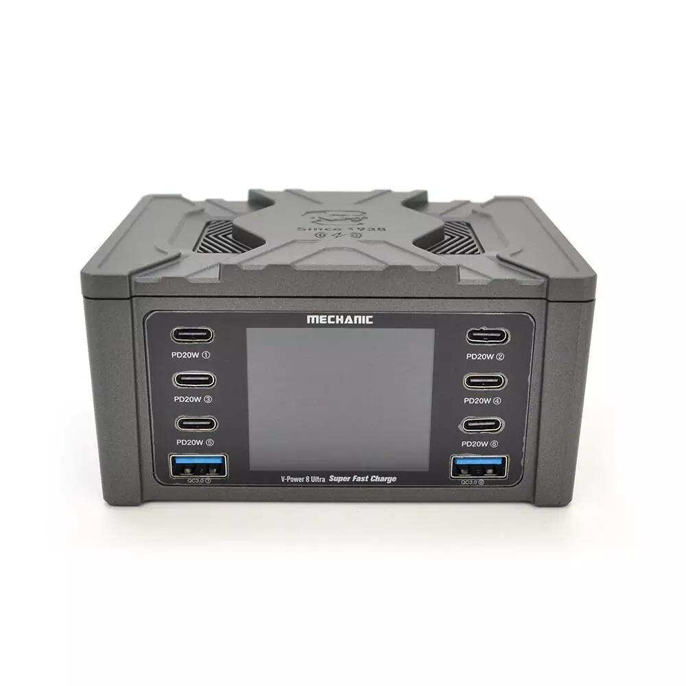 Зарядна станція з цифровою індикацією MECHANIC V-Power 8 Ultra, 2*QC3.0-5В3А,9В2A, 6*PD3.1-(5В/9В/12В/15В)3А,20В2,25A, 220В/160Вт. 114*60*84мм