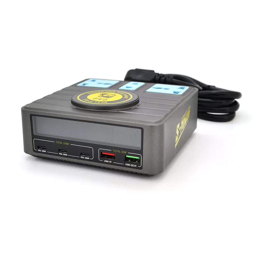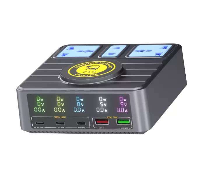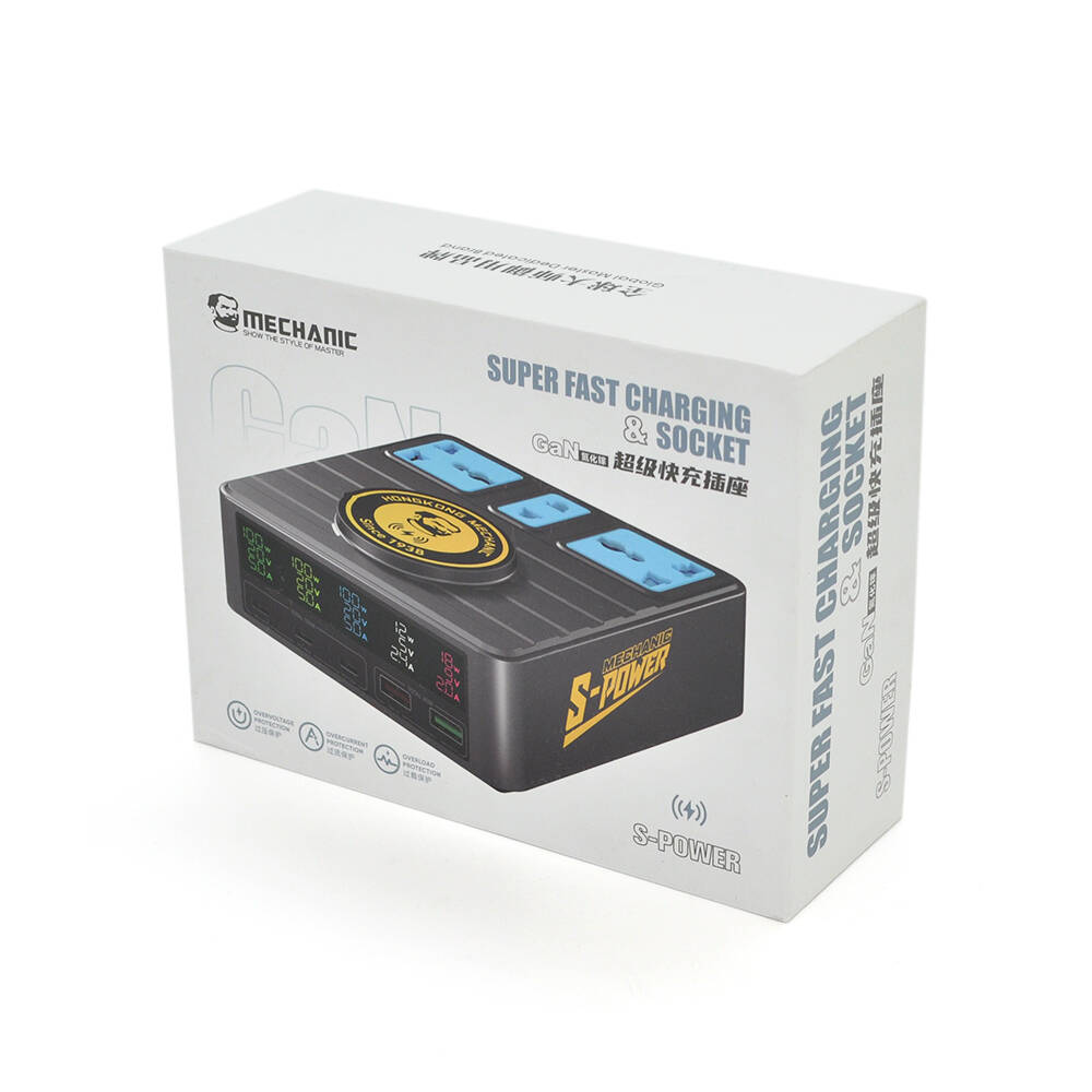 Зарядні станція з цифровою індикацією MECHANIC S-Power, 3*PD3.1-100W, QC3.0-15W, USB-A. Wireless Charging, 3*Socket, 220V/135W. 125*131*54mm