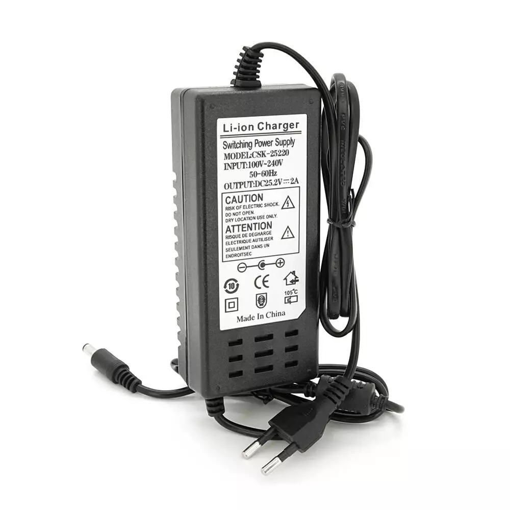 Зарядний пристрій призначений для заряджання літій-іонних акумуляторів (Li-ion) з номінальною напругою 25,2 і кількістю банок 6S (послідовно з'єднаних). Зарядний струм становить 2 А. Пристрій оснащений штекером 5,5-2,1 мм для підключення до акумулятора, що заряджається. Індикація процесу заряджання дозволяє контролювати його стан.