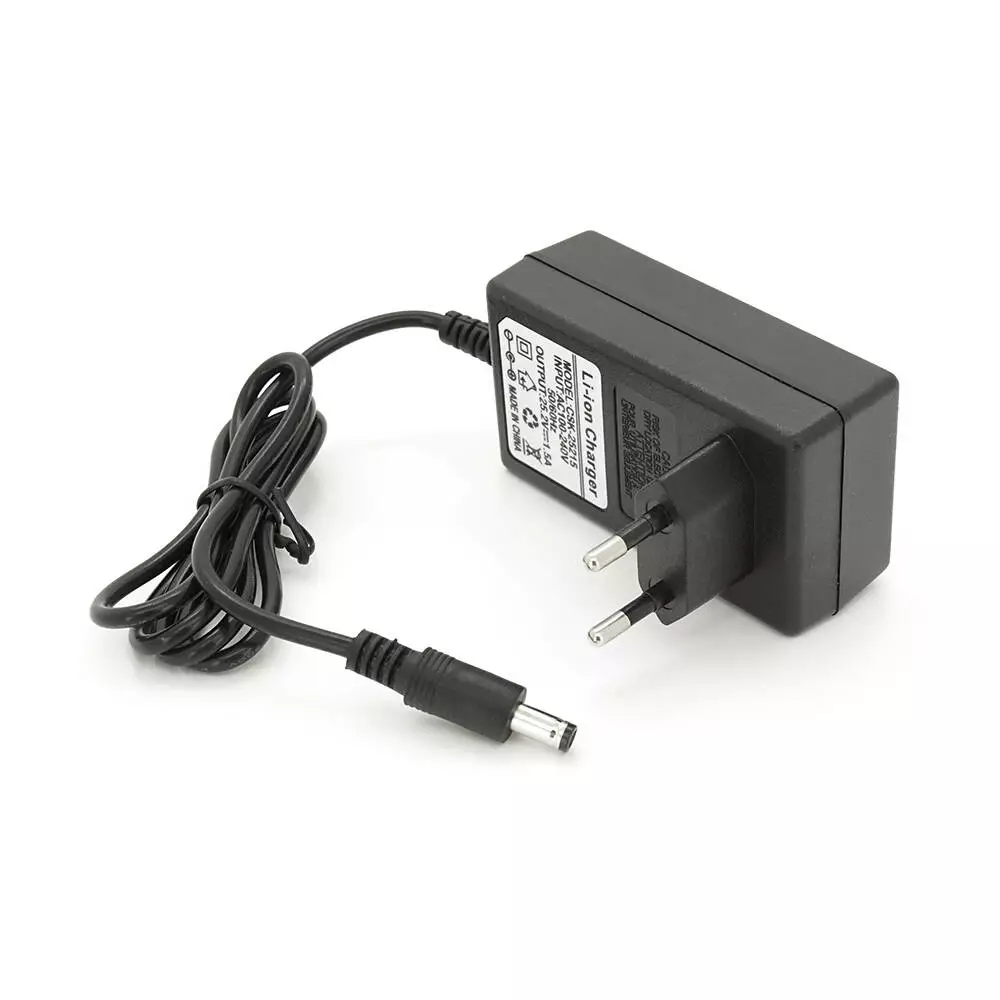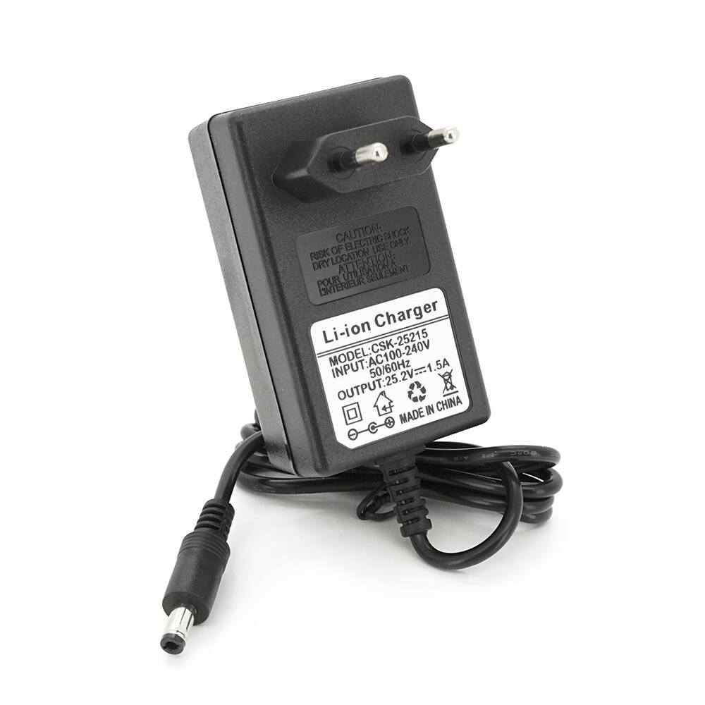 Цей зарядний пристрій призначений для заряджання акумуляторів Li-ion типу 25,2V, 6S з номінальною силою струму 1,5A. Пристрій оснащений штекером 5.5-2.5 та має вбудовану індикацію стану зарядки.