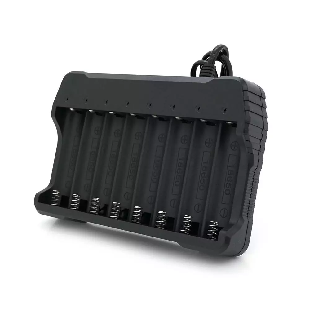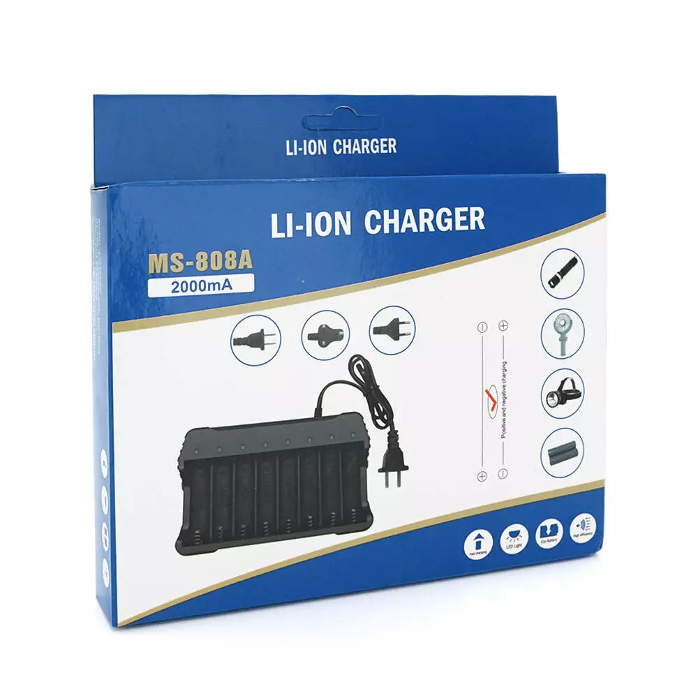 Зарядний пристрій MS-808A призначений для заряджання восьми акумуляторів типу 18650. Пристрій має вихідну напругу 4.2V і ємність 2000mAh.