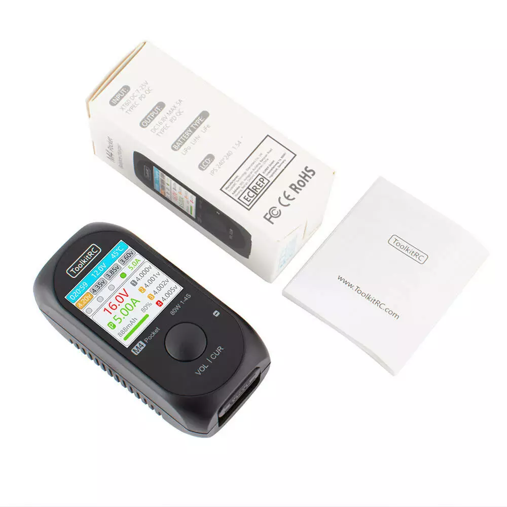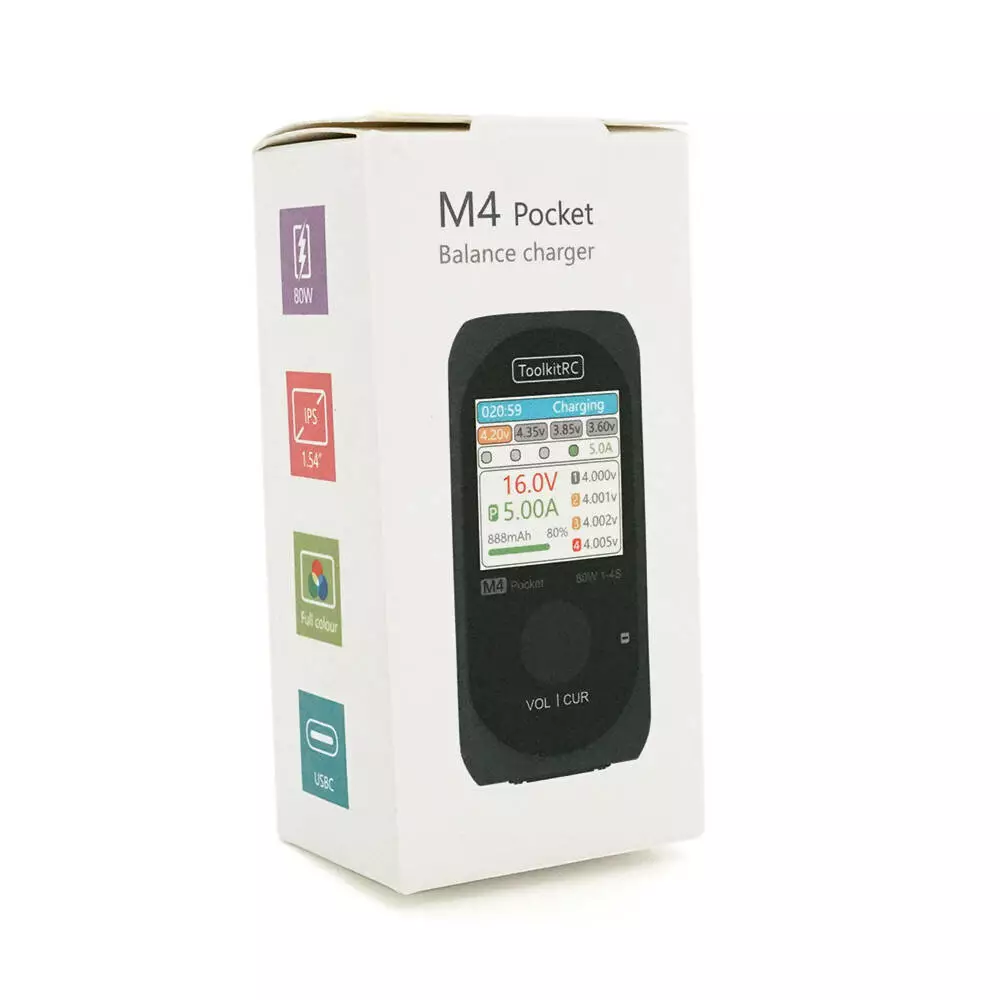 Зарядний пристрій ToolkitRC M4 Pocket 80Вт, тип АКБ LiPo, LiHv, LiFe, Lion, 1-4S, USB-C In/Out, XT60, вхiд 7-25В, вага 75г, без БЖ