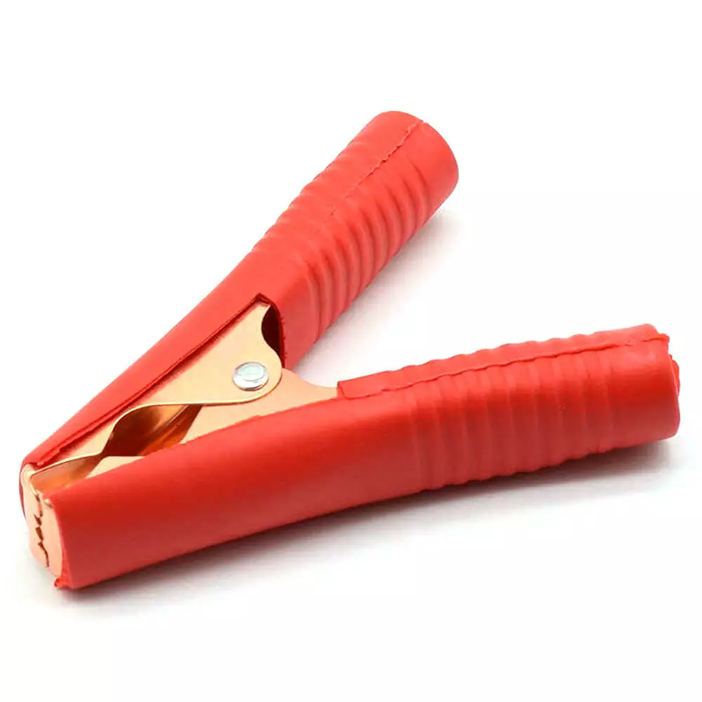Акумуляторний затискач "крокодил" червоного кольору призначений для підключення проводів до акумуляторів автомобілів. Він має щільний гумовий кожух, який забезпечує захист від короткого замикання та забезпечує безпечне підключення.