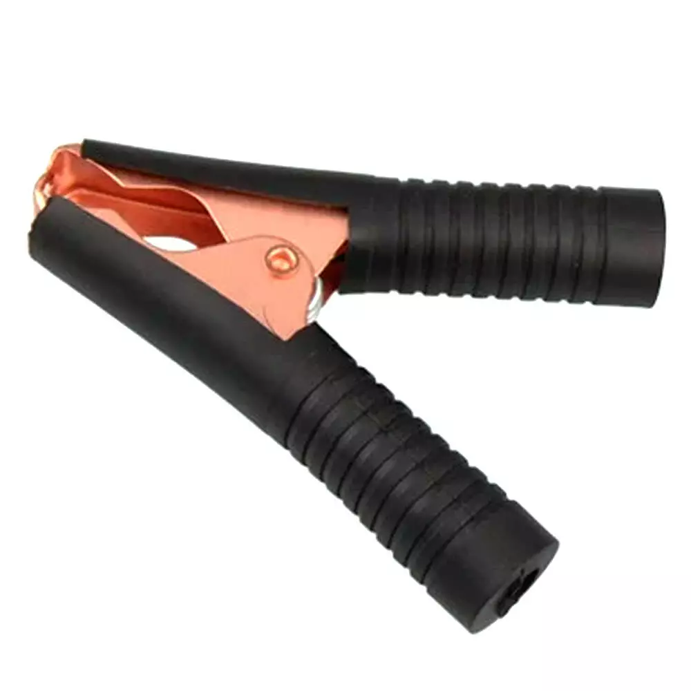 Акумуляторний затиск "крокодил" чорного кольору з щільним гумовим кожухом, призначений для використання в електричних електричних ланцюгах з номінальним струмом до 200А і довжиною 135мм.