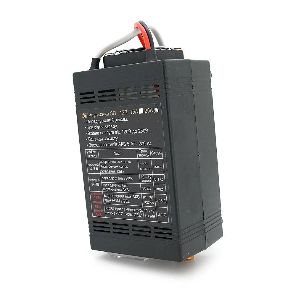 для заряду AGM і гелевих акумуляторів, може використовуватися як передпусковий пристрій для швидкого заряду розрядженої АКБ і як блок живлення 12В 25А.